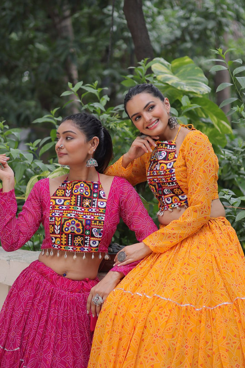 ππ» Celebrate Navratri 2025 in style with this vibrant and traditional Lehenga Choli Set, designed to capture the festive spirit of Garba nights and Dandiya events! Crafted from soft Faux Georgette with iconic Bandhej print, this fully stitched outfit is enhanced with Gamthi embroidery on the blouse and Gotta Patti lace work on the lehenga for a stunning traditional look.