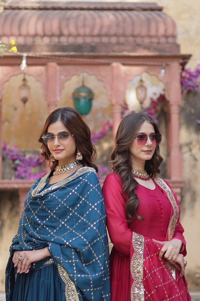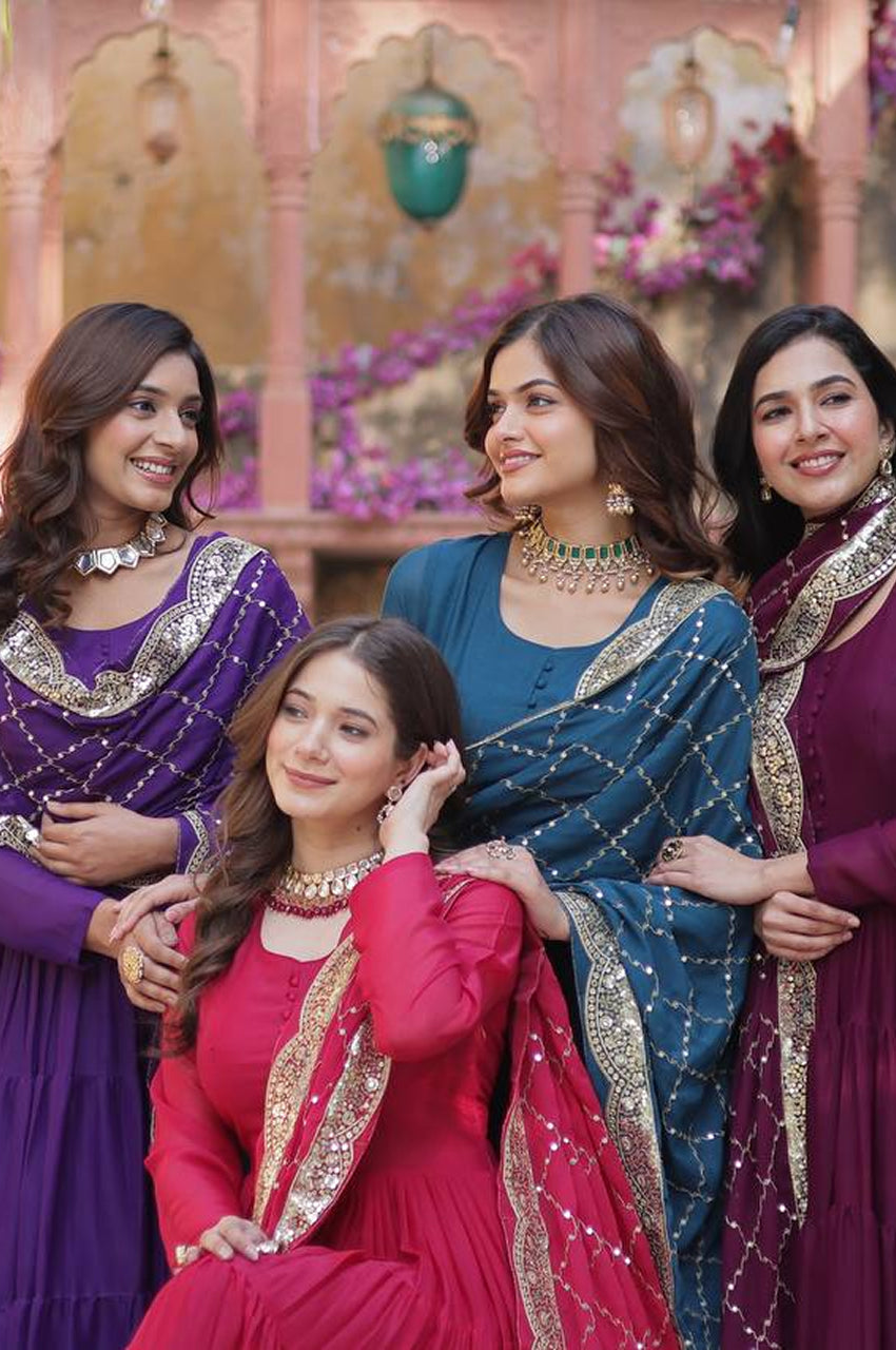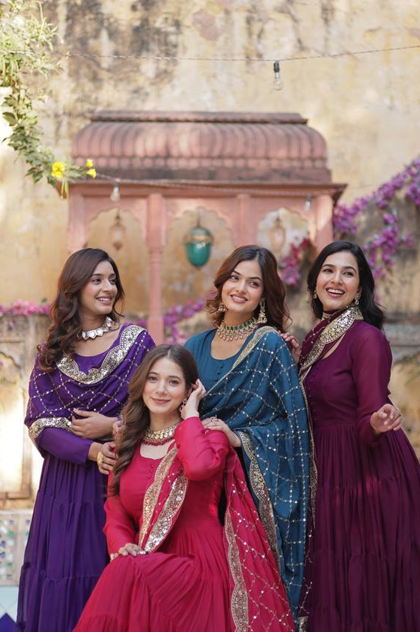 Drape yourself in elegance with this 5-layer frill stitched Star Georgette gown, specially crafted for festive occasions, sangeet nights, and wedding moments. Comes with a richly embroidered designer dupatta, this ready-to-wear masterpiece defines luxury, comfort, and trend β all in one.