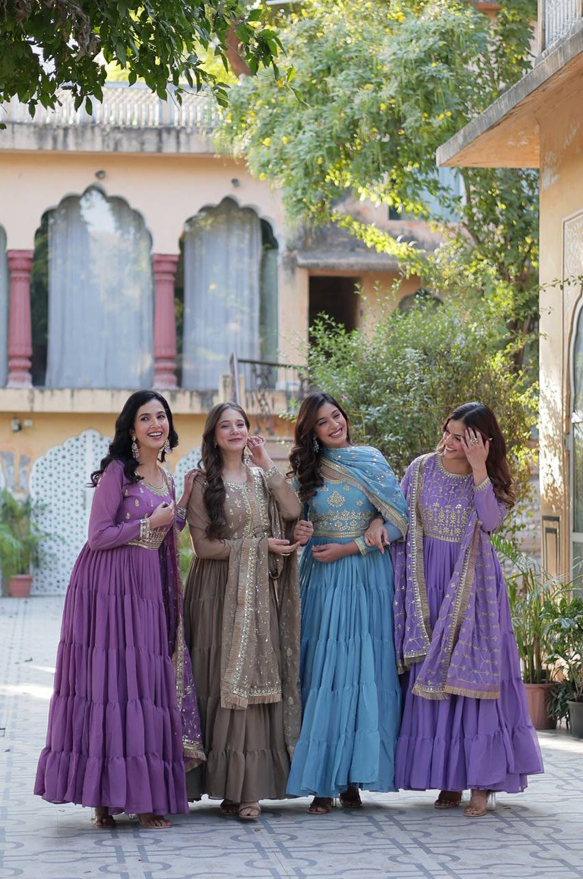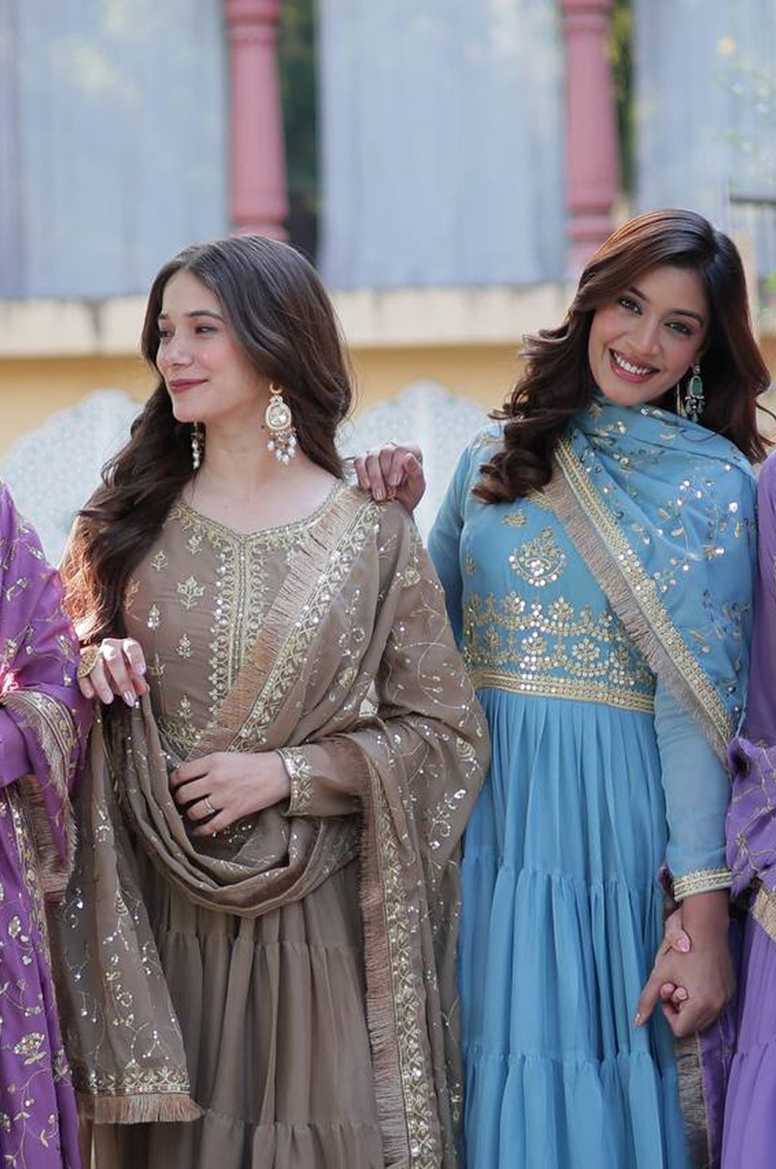 Indulge in elegance with this fully flared 15-meter gown made in rich Star Georgette, designed with a 5-layer frill stitching that adds grand volume and movement. The outfit is paired with a designer dupatta featuring heavy sequins embroidery and a gorgeous lace border, making it the perfect attire for weddings, festive functions, and high-end celebrations.
